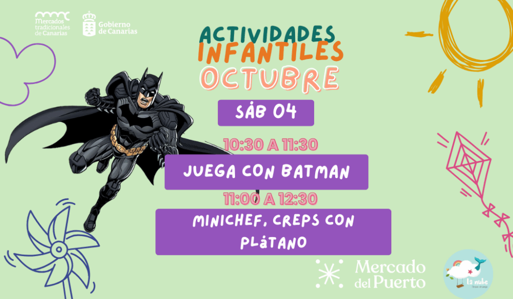 Actividades infantiles: 10.30/11.30 – Batman 11.30/12.30 – Minichef, creps con plátano