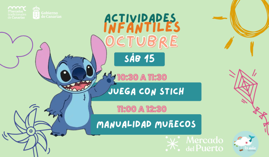 Actividades infantiles: 10.30/11.30 – Juega con Stich 11.30/12.30 – Manualidad Muñecos